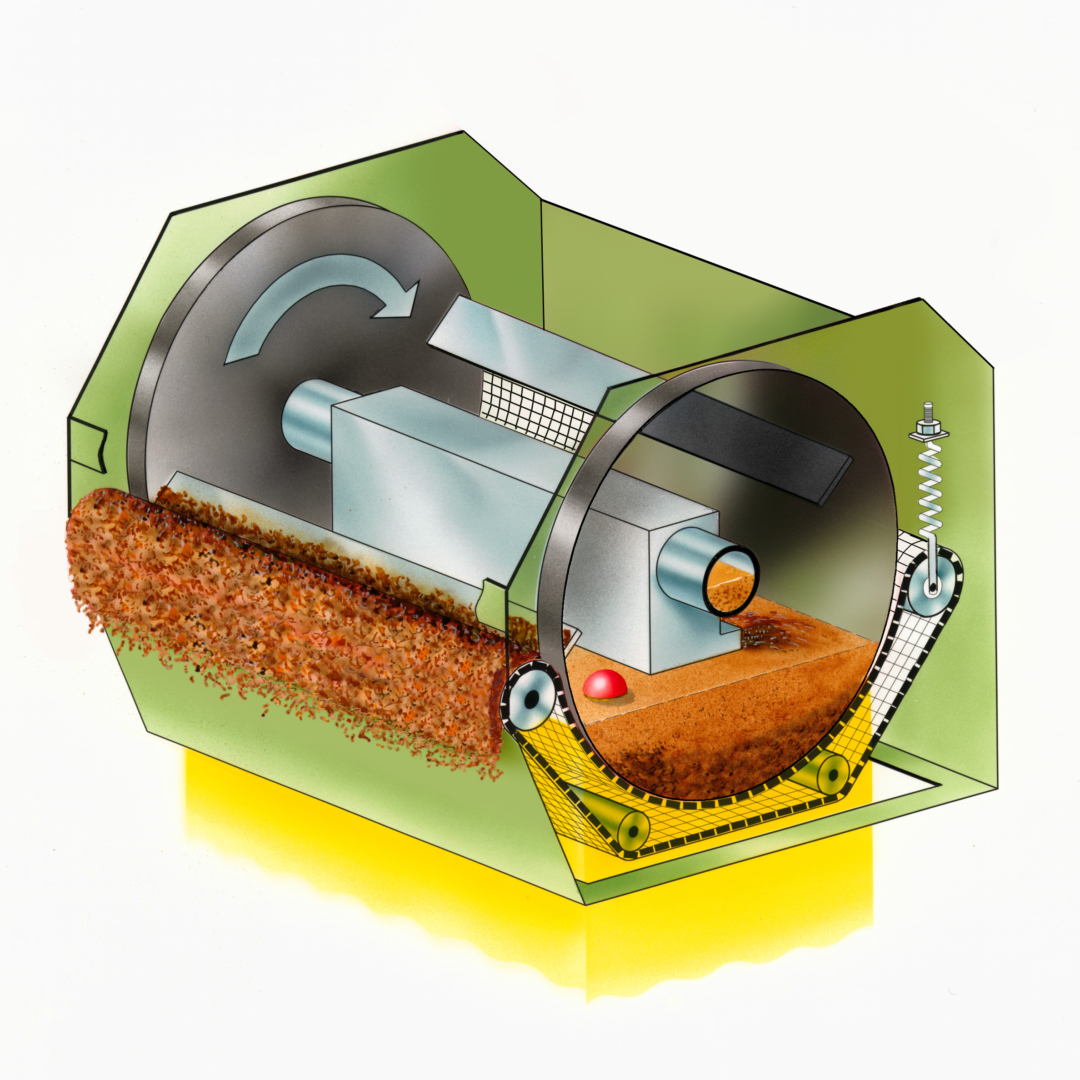 The level in the filtration tank drops and the belt transport switches off. During this process, the filtered sludge and dirt particles are discharged together with the used fleece on the side opposite the feed. For processing larger quantities of sludge, chips and particles, individual carriers, similar to shovels, are attached between the disc wheels. They easily eject all sludge and coarse chips without damaging the filter fleece. The entire filtration process is fully automatic. A special sensor constantly monitors the diameter of the fleece roll and, when the roll diameter reaches a minimum, indicates that the roll needs to be changed.